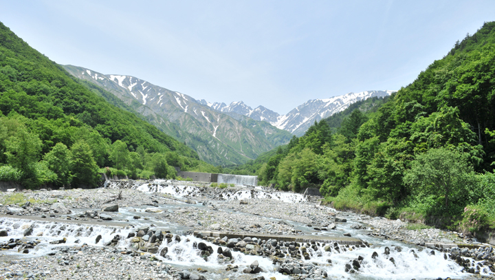 - 7年の歳月と延べ1000万人の人手をかけ、昭和38年に完成した黒部ダムは、アーチダムの中でも力学的に最も進化したアーチ式ドーム越流型ダム。高さ186m、堤長492mは日本最大、世界でも最高クラスです。水);煙をあげる迫力ある放水は見物。