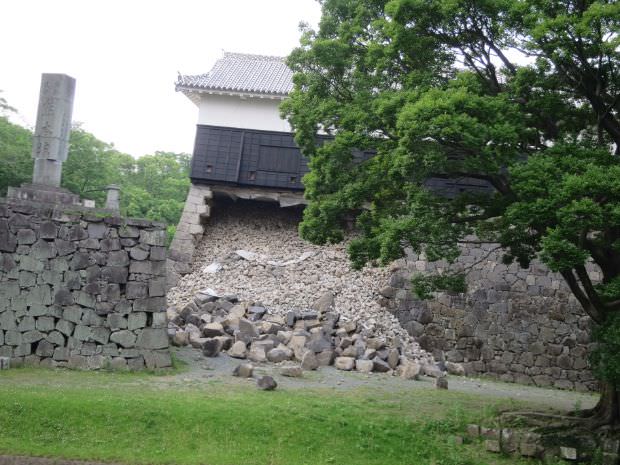 また、熊本城への入園は禁止されていました。何度もテレビで映されている石垣の一本柱の櫓や周りの石垣、塀など、外見的には、熊本城の被害が一番大きい様です。