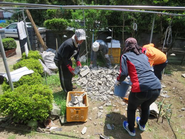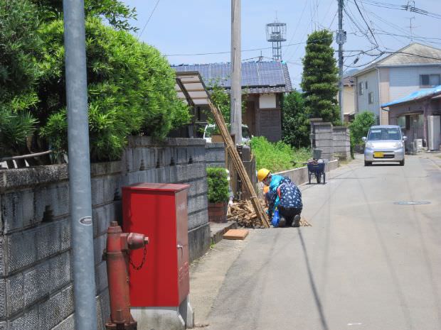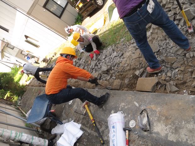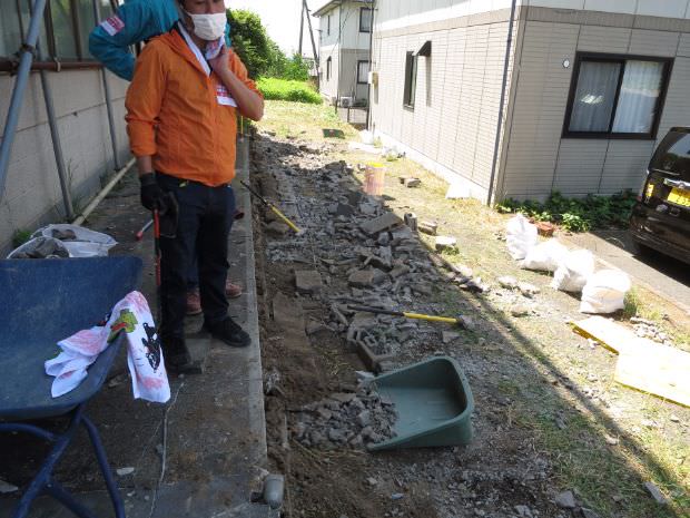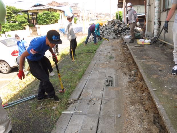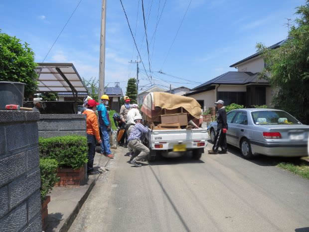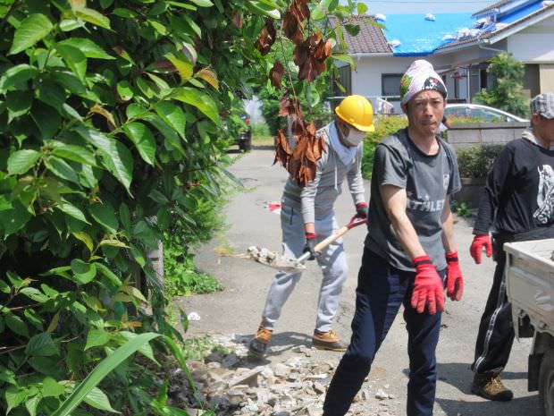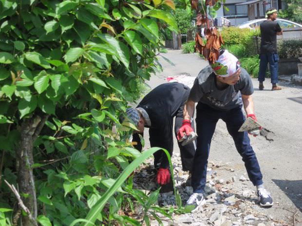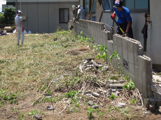 私たちは、リーダーの指示に従い、先ず民家の目の前の道幅を確保する為、向かい側の民家の崩れた塀の撤去作業から開始。気温は、ぐんぐんと上昇、昼前には既に30度になっており大変な作業になりました。