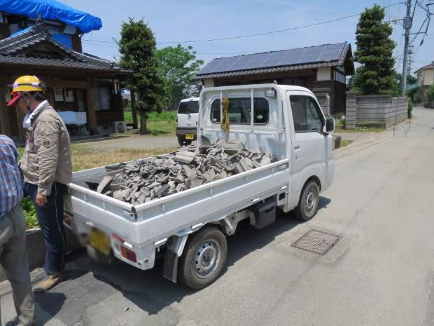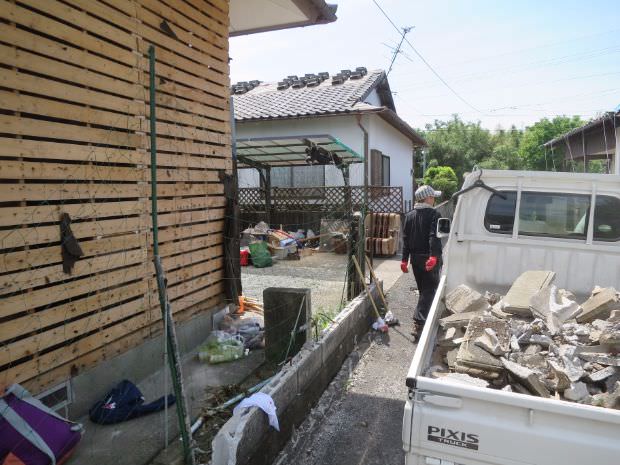 ブロック塀は横倒しになっていたので、撤去する為に、ハンマーで細く砕き割った上で、軽トラックに積載。軽トラックはボランティアセンターが用意したもので、数回に分けて、ゴミ集積場へ運びました。