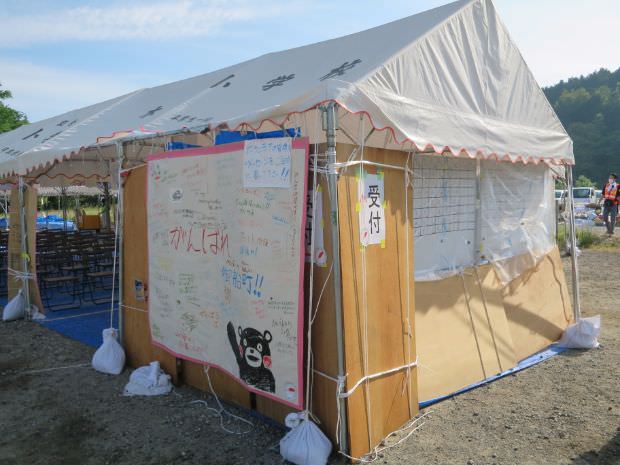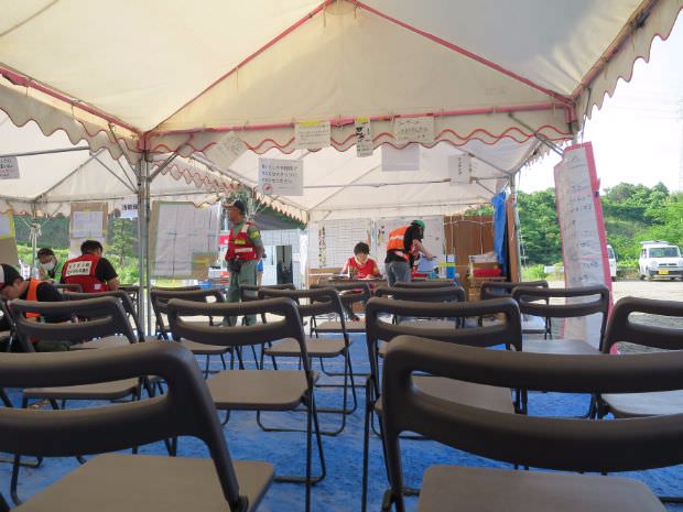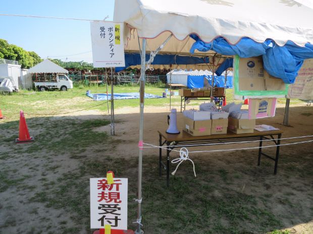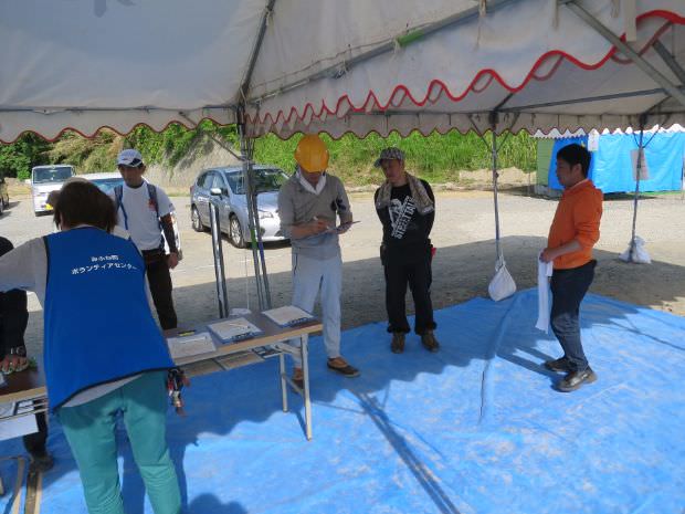 本日は200名を予定していて、本日迄のボランティア数は延べ13,000名との事。受付は「継続」と「新規」で8:30の時点では「新規」が100名程度、「継続」が80名程度並んでおり、益城町社会福祉協議会が非常に手際良く仕切っていて、受付・説明・活動のマッチングやアサインを行っていました。