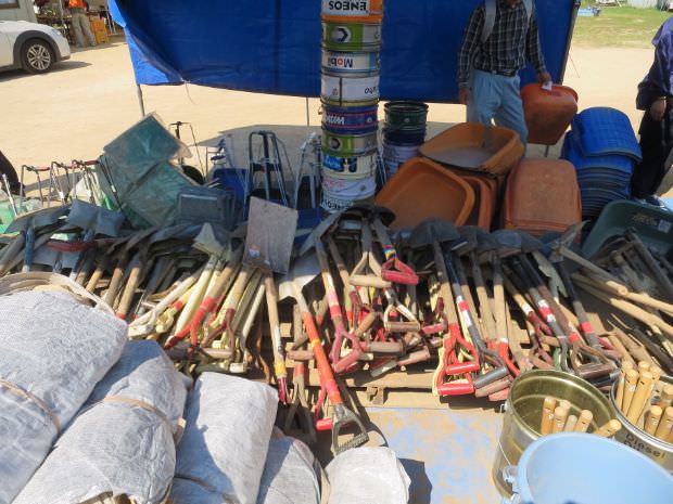 センターには、ボランティア活動に必要なもの、例えば軍手やゴム製の手袋・ヘルメット・防塵マスク・靴のインナーソール・ゴーグル・タオル・飲料水・一輪車(ネコ)やスコップ・ハンマー・バール(くぎ抜き)などの資材も豊富に用意されて、自由に使って良いとの事でした。