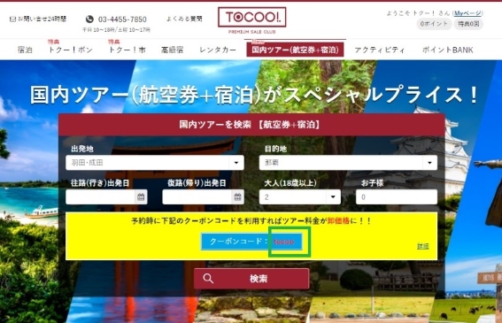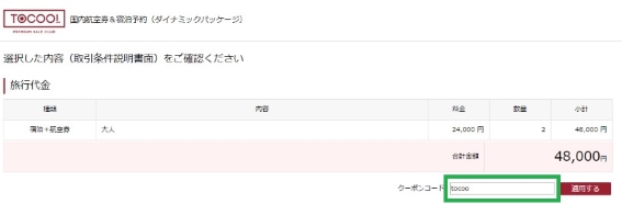 3. ツアー作成後、ページを進むとクーポンコードを入力する箇所がありますので、「1.」で取得したクーポンコードを入力し、「適用する」ボタンをクリックすると、料金が卸価格に変更され、その価格でご予約いただけます。