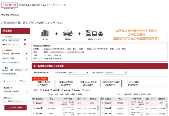 2. 検索結果に進み、ご希望の航空会社及び宿を選択して自由にパッケージツアーをお作りください。
